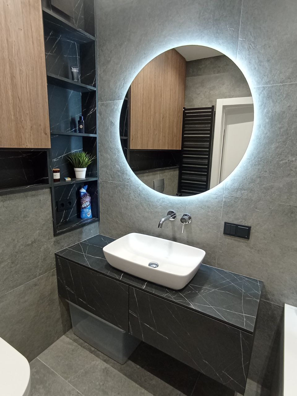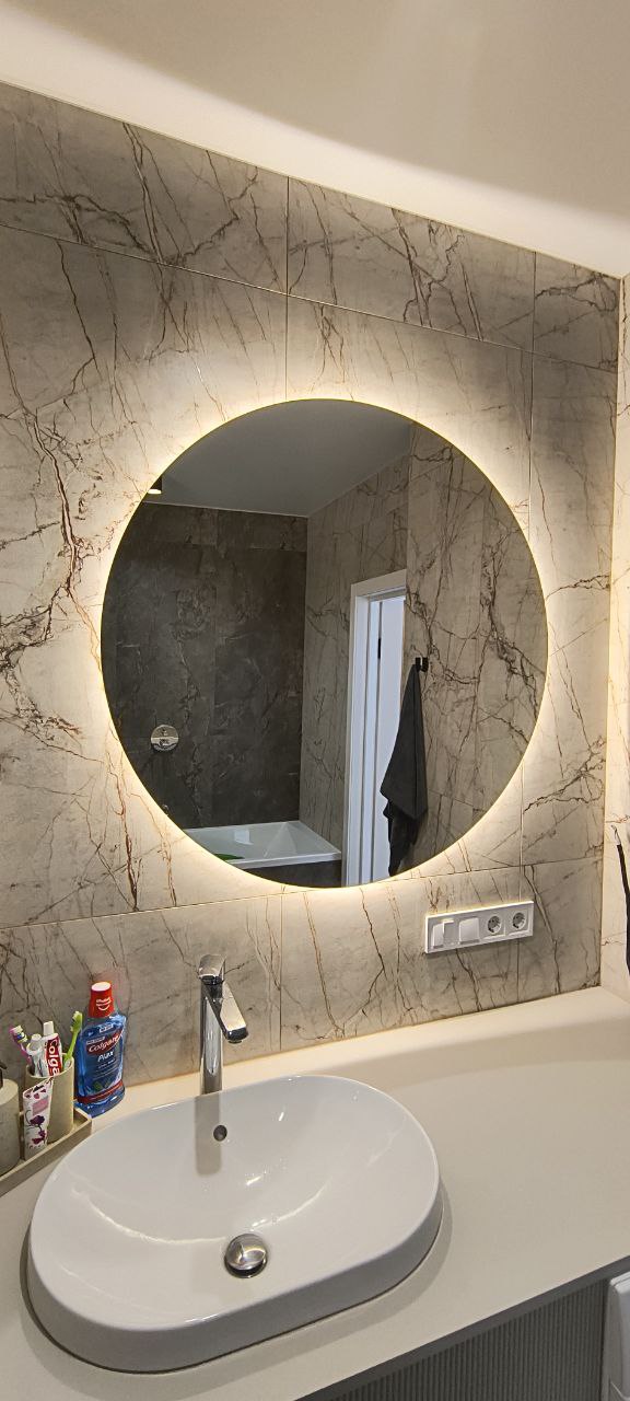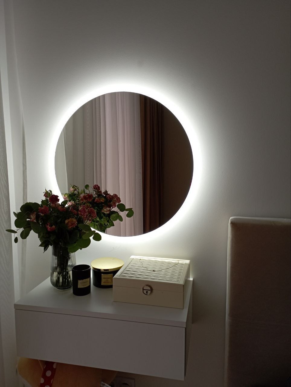 Кругле дзеркало з LED-підсвіткою, що створює ефект фону, додаючи об’єму та сучасності інтер’єру.